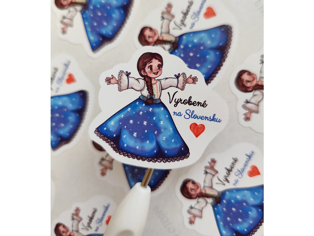 Postavička slovenského dievčatka v kroji je mnou kreslená s láskou a symbolizuje poctivú ručnú tvorbu, radosť z práce a hrdosť na to, že veci vznikajú doma.