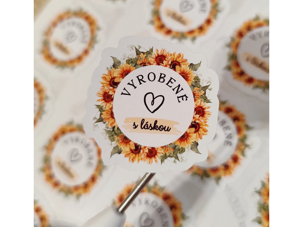 Jemné a elegantné nálepky s textom „Vyrobené s láskou“, ktoré dodajú každému baleniu osobný a poctivý nádych.