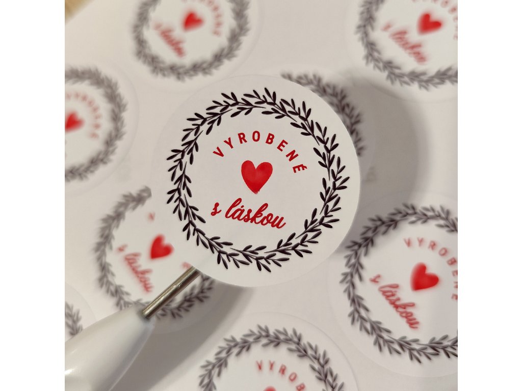 Jemné a elegantné nálepky s textom „Vyrobené s láskou“, ktoré dodajú každému baleniu osobný a poctivý nádych.