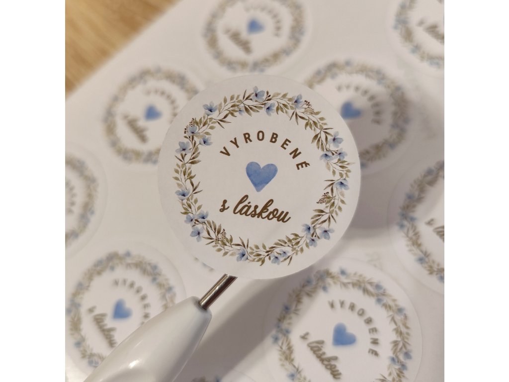 Jemné a elegantné nálepky s textom „Vyrobené s láskou“, ktoré dodajú každému baleniu osobný a poctivý nádych.