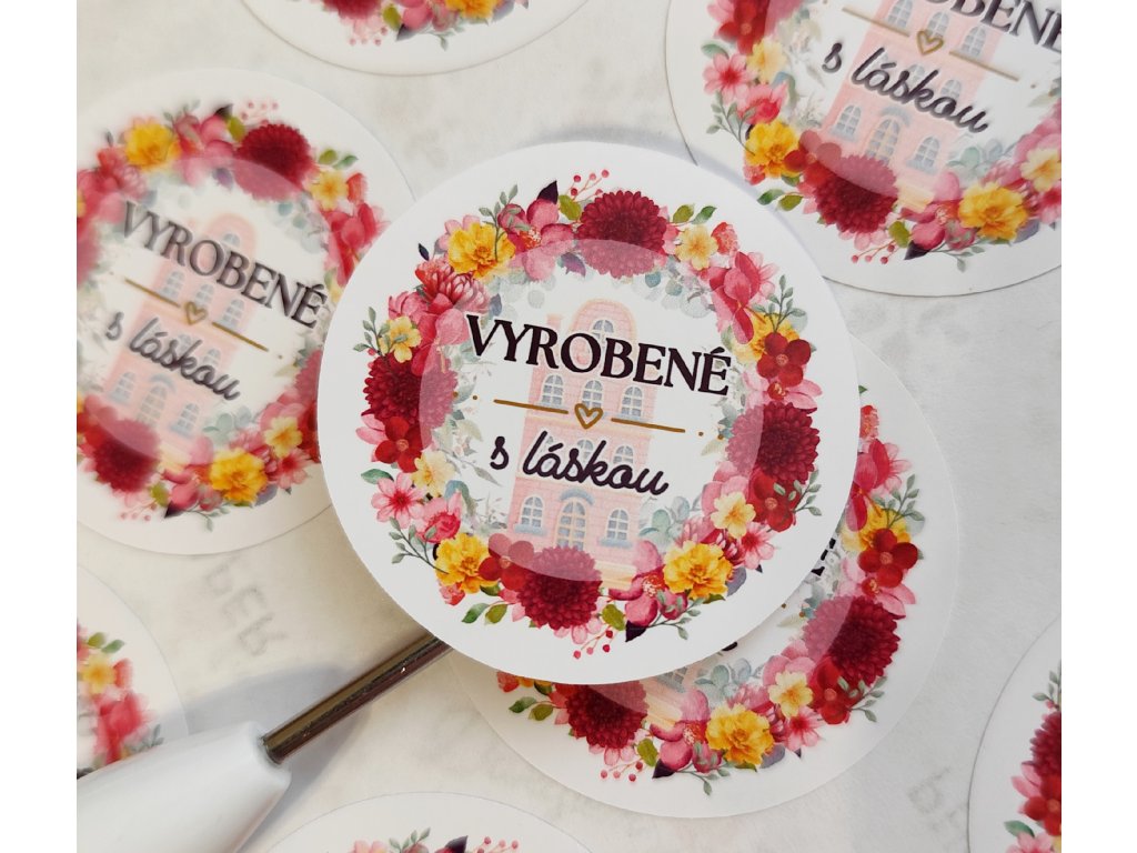 Jemné a elegantné nálepky s textom „Vyrobené s láskou“, ktoré dodajú každému baleniu osobný a poctivý nádych.